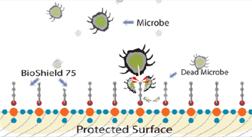BioShield 75 is a unique product that works better than any of the leading disinfectants. One end of its molecule creates a strong bond with a multitude of surfaces, porous and non-porous, forming a highly durable protective coating. The other end of the molecule forms a microscopic bed of spikes that punctures microbes like a bed of nails. BioShield 75 physically ruptures the cell walls of these microbes, without the use of poisons. Since its methodology is mechanical instead of a poison, it does not create “super bugs”, which are microbes that build up resistance to treatment.